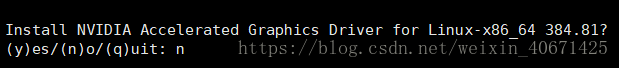 单击回车,一路往下运行,直到提示“是否为NVIDIA安装驱动nvidia-384?”,选择否,因为已经安装好驱动程序了,其他的全都是默认,不过要记住安装位置,默认是安装在/usr/local/cuda-9.0文件夹下。