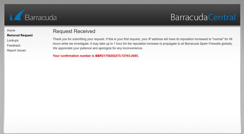 如果邮件群发时,发现退信显示IP被barracudacentral列入黑名单,可以登录其官网申请移除,步骤如下: