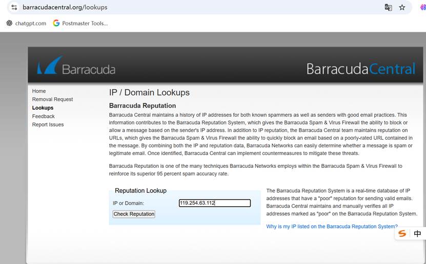 1,登录网址https://www.barracudacentral.org/lookups,输入您的IP,点击“check reputation”