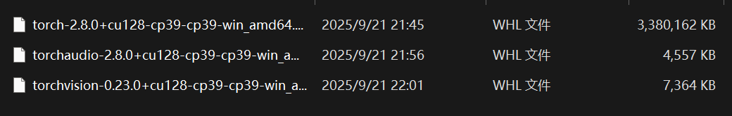 参考了安装cuda对应的pytorch这篇文章,进入网站 https://download.pytorch.org/whl/cu128,找到进入 torch、torchvision、torchaudio 三大组件各自的网站,将对应的文件下载下来(提前新建好文件夹,好找的路径),记住文件下载的位置,下面安装要用。