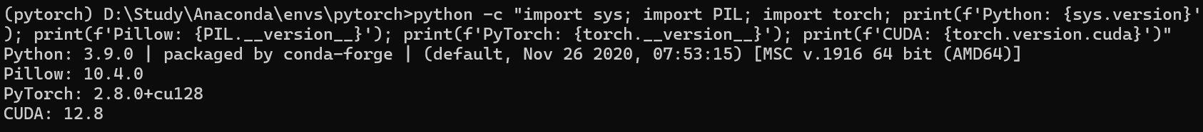 python -c "import sys; import PIL; import torch; print(f'Python: {sys.version}'); print(f'Pillow: {PIL.__version__}'); print(f'PyTorch: {torch.__version__}'); print(f'CUDA: {torch.version.cuda}')"