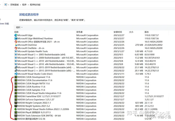 我们都知道,cuda的一般卸载需要依次选中需要卸载的CUDA包,鼠标右键点击卸载即可,一般需要保留3个已经安装的CUDA包,分别为NVIDIA GeForce Experience x.x.x.x、NVIDIA PhysX 系统软件 x.x.x、NVIDIA 图形驱动程序 x.x。